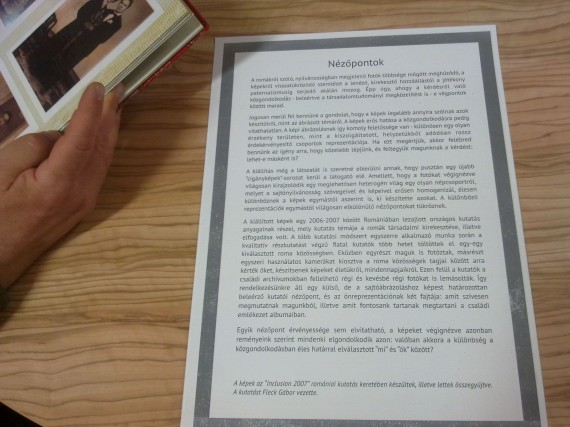 A bejárattól balra az EU Akadémia diákjainak képei kerültek bemutatásra, melyeket egy kolozsvári látogatás során készítettek. A hely szellemét igyekeztek valamilyen módon vizuálisan „nyakon csípni”. A helyiségbe lépve balra fordulva pedig egy romániai roma közösségeket vizsgáló szociológiai terepmunka fotóanyagból láthatunk válogatást. Három nézőpontból látunk itt bemutatva különböző roma közösségeket: egyrészt a terepkutatók által készített fotókon külső nézőpontból, másrészt a közösség tagjai által saját magukról, másrészt e közösségek családi fotóalbumaiból láthatunk egy kis válogatást egy albumba rendezve. A terepen dolgozó kutatóknak az is feladatuk közé tartozott, hogy az emberi megismerés nézőpontjait ne csak verbális, hanem képi úton is kifejezzék. A válogatás inkább szól a nézőpontok sajátosságairól, jellemzőiről, mintsem a romákról. Minden kép egy külön élettörténet, ezek a képek mesélnek nekünk. Arra igyekeznek ráébreszteni minket, hogy az a cigánykép, melyet a médiából ismerünk, mennyire nem fedi azt, ahogy egy közösséget közelről megismerő kutató mutatja be ugyanezt a témát, és milyen nagyon távol áll attól, ahogy a romák magukat szeretnék láttatni. Az üzenet egyértelmű: ha közelebbről megismersz egy közösséget, egy népet, felfedezed, hogy nem is annyira különbözik Tőled.
